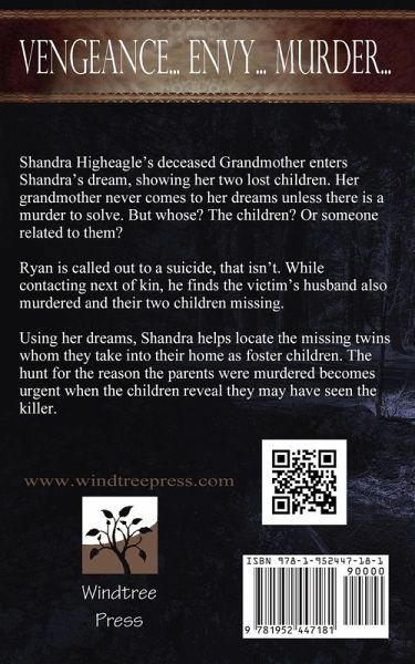 Book 15 Shandra Higheagle Mystery Series Vengeance...Envy...Murder Shandra Higheagle's deceased Grandmother enters Shandra's dream, showing her two lost children. Her grandmother never comes to her dreams unless there is a murder to solve. But whose? The children? Or someone related to them? Ryan is called out to a suicide, that isn't. While contacting next of kin, he finds the victim's husband also murdered and their two children missing. Using her dreams, Shandra helps locate the missing twins whom they take into their home as foster children. The hunt for the reason the parents were murdered becomes urgent when the children reveal they may have seen the killer.