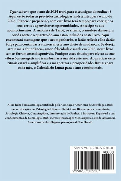Quer saber o que o ano de 2025 trará para o seu signo do zodíaco? Aqui estão todas as previsões astrológicas, mês a mês, para o ano de 2025. Planeie e prepare-se, com este livro terá tempo para corrigir os seus erros e aproveitar as oportunidades. Antecipe-se aos acontecimentos. A sua carta de Tarot, os rituais, o amuleto da sorte, a cor da sorte e o quartzo do ano estão incluídos neste livro. Aqui encontrará mensagens que o acompanharão, o farão refletir e lhe darão força para continuar a atravessar este ano cheio de mudanças. Se deseja atrair mais abundância, amor, felicidade e saúde em 2025, neste livro tem as ferramentas disponíveis. Pratique estes rituais para elevar as suas vibrações energéticas e transformar a sua vida este ano. Ao praticar estes rituais estará a amplificar e a magnetizar a prosperidade. Rituais para cada mês, o Calendário Lunar para o ano e muito mais.