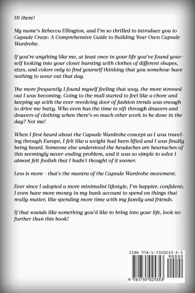 Hi there! My name's Rebecca Ellington, and I'm so thrilled to introduce you to Capsule Craze: A Comprehensive Guide to Building Your Own Capsule Wardrobe. If you're anything like me, at least once in your life you've found yourself looking into your closet bursting with clothes of different shapes, sizes, and colors only to find yourself thinking that you somehow have nothing to wear out that day. The more frequently I found myself feeling that way, the more stressed out I was becoming. Going to the mall started to feel like a chore and keeping up with the ever-revolving door of fashion trends was enough to drive me batty. Who even has the time to sift through drawers and drawers of clothing when there's so much other work to be done in the day? Not me! When I first heard about the Capsule Wardrobe concept as I was traveling through Europe, I felt like a weight had been lifted and I was finally being heard. Someone else understood the headaches are heartaches of this seemingly never-ending problem, and it was so simple to solve I almost felt foolish that I hadn't thought of it sooner. Less is more - that's the mantra of the Capsule Wardrobe movement. Ever since I adopted a more minimalist lifestyle, I'm happier, confident; I even have more money in my bank account to spend on things that really matter, like spending more time with my family and friends. If that sounds like something you'd like to bring into your life, look no further than this book!