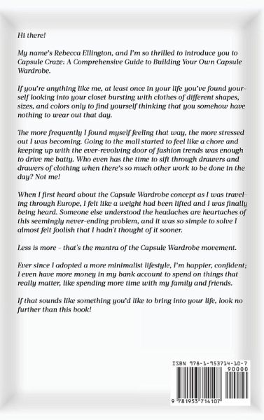 Hi there! My name's Rebecca Ellington, and I'm so thrilled to introduce you to Capsule Craze: A Comprehensive Guide to Building Your Own Capsule Wardrobe. If you're anything like me, at least once in your life you've found yourself looking into your closet bursting with clothes of different shapes, sizes, and colors only to find yourself thinking that you somehow have nothing to wear out that day. The more frequently I found myself feeling that way, the more stressed out I was becoming. Going to the mall started to feel like a chore and keeping up with the ever-revolving door of fashion trends was enough to drive me batty. Who even has the time to sift through drawers and drawers of clothing when there's so much other work to be done in the day? Not me! When I first heard about the Capsule Wardrobe concept as I was traveling through Europe, I felt like a weight had been lifted and I was finally being heard. Someone else understood the headaches are heartaches of this seemingly never-ending problem, and it was so simple to solve I almost felt foolish that I hadn't thought of it sooner. Less is more - that's the mantra of the Capsule Wardrobe movement. Ever since I adopted a more minimalist lifestyle, I'm happier, confident; I even have more money in my bank account to spend on things that really matter, like spending more time with my family and friends. If that sounds like something you'd like to bring into your life, look no further than this book!