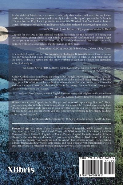 Capsule for the Day is a daily devotional that offers healing words in our world-a world created by God that is good but broken and wounded. Each capsule tells a story that gives voice to our own stories. It celebrates our joys and victories. It reveals the beauty lurking in our brokenness and the message in our mess. The capsule calls us to faith and to respond to God's gift of himself. It inspires hope. It challenges us to cooperate with God in rough times and even in the midst of evil, to be expectant, and to wait for the birth of that which at a given moment is shrouded in mystery. It summons us to keep a steady relationship with God through prayer. It reminds us that we are loved by the Father and called to love him and our neighbours. Capsule for the Day seeks to strengthen us as we journey through life. It is a guide that enables us to navigate our way in the world to seek God, to gather around him, and to find our purpose. It asks the question, what do you live for? And day by day, it leads us to Christ in whom we find answers to our ultimate questions.