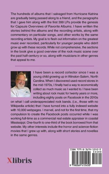 The hundreds of albums that I salvaged from Hurricane Katrina are gradually being passed along to a friend, and the paragraphs that I gave him along with the first 399 LPs provide the genesis for Capsule Overviews of Favorite Albums. I have written the stories behind the albums and the recording artists, along with commentary on particular songs, and other works by the same recording artists. My goal is to flesh out information on the greatest music ever recorded, particularly for younger people who didn't grow up with these records. While not comprehensive, the sections in the book give a good overview of the rock music scene over the past half-century or so, along with musicians in other genres that appeal to me.