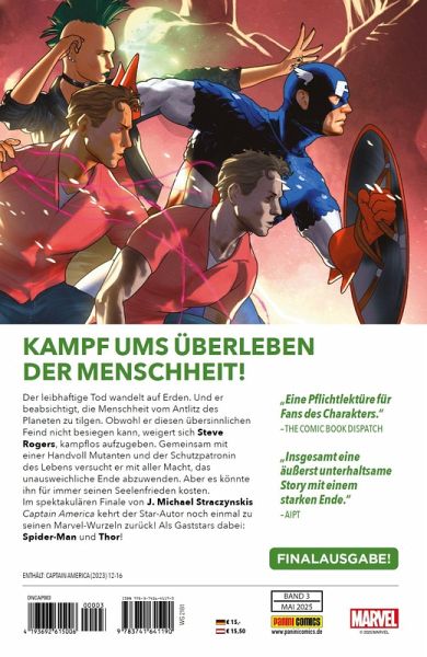 KAMPF UMS ÜBERLEBEN DER MENSCHHEIT! Der leibhaftige Tod wandelt auf Erden. Und er beabsichtigt, die Menschheit vom Antlitz des Planeten zu tilgen. Obwohl er diesen übersinnlichen Feind nicht besiegen kann, weigert sich Steve Rogers, kampflos aufzugeben. Gemeinsam mit einer Handvoll Mutanten und der Schutzpatronin des Lebens versucht er mit aller Macht, das unausweichliche Ende abzuwenden. Aber es könnte ihn für immer seinen Seelenfrieden kosten. Im spektakulären Finale von J. Michael Straczynskis Captain America kehrt der Star-Autor noch einmal zu seinen Marvel-Wurzeln zurück! Als Gaststars dabei: Spider-Man und Thor! ENTHÄLT: CAPTAIN AMERICA (2023) 12-16 FINALAUSGABE!
