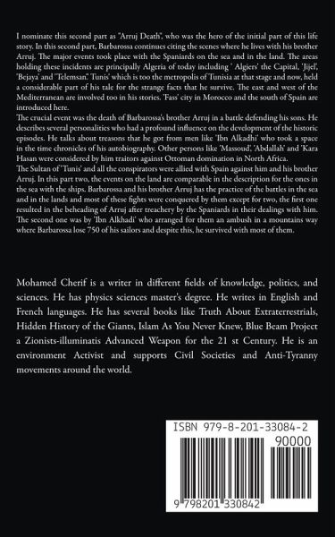 I nominate this second part as "Arruj Death", who was the hero of the initial part of this life story. In this second part, Barbarossa continues citing the scenes that he live with his brother Arruj. The major events took place with the Spaniards in the sea and in the land. The areas holding these incidents are principally Algeria of today including ' Algiers' the Capital, 'Jijel', 'Bejaya' and 'Telemsan'.'Tunis' which is too the metropolis of Tunisia at that stage and now, held a considerable part of his tale for the strange facts that he survive. The east and west of the Mediterranean are involved too in his stories. 'Fass' city in Morocco and the south of Spain are introduced here. The crucial event was the death of Barbarossa brother Arruj in a battle defending his sons. He describes several personalities who had a profound influence on the development of the historic episodes. He talks about treasons that he got by men like 'Ibn Alkadhi' who took a space in the time chronicles of his autobiography. Other persons like 'Massoud', 'Abdallah' and 'Kara Hasan' considered by him as traitors against the Ottoman domination in North Africa. The Sultan of 'Tunis' and all the conspirators were allied with the Spain against him and his brother Arruj. In this part two, the events in the land are comparable in description for the ones in the sea with the ships. Barbarossa and his brother Arruj has the practice of the battles in the sea and in the lands and most of these fights were conquered by them except for two, the first one resulted by the beheading of Arruj after a treachery by the Spaniards in their deal with him. The second one was by 'Ibn Alkhadi' who arranged for them an ambush in a mountains way where Barbarossa lose 750 of his sailors and despite this he survived with most of them.