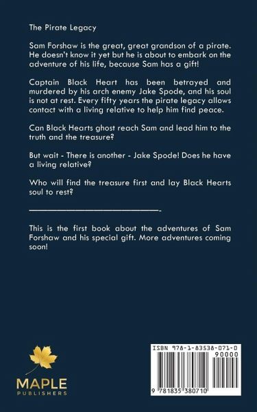 The Pirate Legacy Sam Forshaw is the great, great grandson of a pirate. He doesn't know it yet but he is about to embark on the adventure of his life, because Sam has a gift! Captain Black Heart has been betrayed and murdered by his arch enemy Jake Spode, and his soul is not at rest. Every fifty years the pirate legacy allows contact with a living relative to help him find peace. Can Black Hearts ghost reach Sam and lead him to the truth and the treasure? But wait - There is another - Jake Spode! Does he have a living relative? Who will find the treasure first and lay Black Hearts soul to rest? This is the first book about the adventures of Sam Forshaw and his special gift. More adventures coming soon!