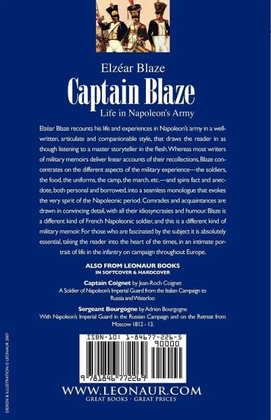 Captain Blaze: Life in Napoleon's Army Elzéar Blaze recounts his life and experiences in Napoleon's army in a well-written, articulate and companionable style, that draws the reader in as though listening to a master storyteller in the flesh. Whereas most writers of military memoirs deliver linear accounts of their recollections, Blaze concentrates on the different aspects of the military experience-the soldiers, the food, the uniforms, the camp, the march, etc.-and spins fact and anecdote, both personal and borrowed, into a seamless monologue that evokes the very spirit of the Napoleonic period. Comrades and acquaintances are drawn in convincing detail, with all their idiosyncrasies and humour. Blaze is a different kind of French Napoleonic soldier, and this is a different kind of military memoir. For those who are fascinated by the subject it is absolutely essential, taking the reader into the heart of the times, in an intimate portrait of life in the infantry on campaign throughout Europe.