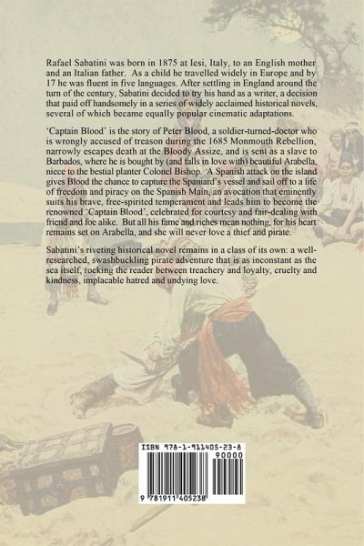 Rafael Sabatini was born in 1875 at Iesi, Italy, to an English mother and an Italian father. As a child he travelled widely in Europe and by 17 he was fluent in five languages. After settling in England around the turn of the century, Sabatini decided to try his hand as a writer, a decision that paid off handsomely in a series of widely acclaimed historical novels, several of which became equally popular cinematic adaptations. Captain Blood is the story of Peter Blood, a soldier-turned-doctor who is wrongly accused of treason during the 1685 Monmouth Rebellion, narrowly escapes death at the Bloody Assize, and is sent as a slave to Barbados, where he is bought by (and falls in love with) beautiful Arabella, niece to the bestial planter Colonel Bishop. A Spanish attack on the island gives Blood the chance to capture the Spaniard’s vessel and sail off to a life of freedom and piracy on the Spanish Main, an avocation that eminently suits his brave, free-spirited temperament and leads him to become the renowned ‘Captain Blood’, celebrated for courtesy and fair-dealing with friend and foe alike. But all his fame and riches mean nothing, for his heart remains set on Arabella, and she will never love a thief and pirate. Sabatini’s riveting historical novel remains in a class of its own: a well-researched, swashbuckling pirate adventure that is as inconstant as the sea itself, rocking the reader between treachery and loyalty, cruelty and kindness, implacable hatred and undying love.