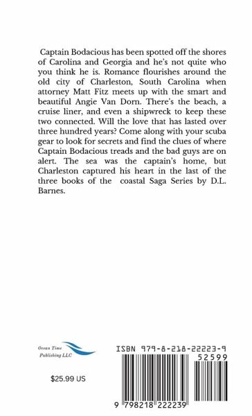 Captain Bodacious has been spotted off the shores of Carolina and Georgia and he's not quite who you think he is. Romance flourishes around the old city of Charleston, South Carolina, when attorney Matt Fitz meets up with the smart and beautiful Angie Van Dorn. Oh, there's the beach, a cruise liner, and even a shipwreck to keep these two connected. Will the connection be strong enough to reveal the secret ties of love that have lasted over three hundred years? Come along with your scuba gear to look for secrets and find the clues of where Captain Bodacious treads and the bad guys are on alert. The sea was the Captain's home, but Charleston captured his heart in the last of the three books of the Coastal Saga Series by D.L. Barnes.