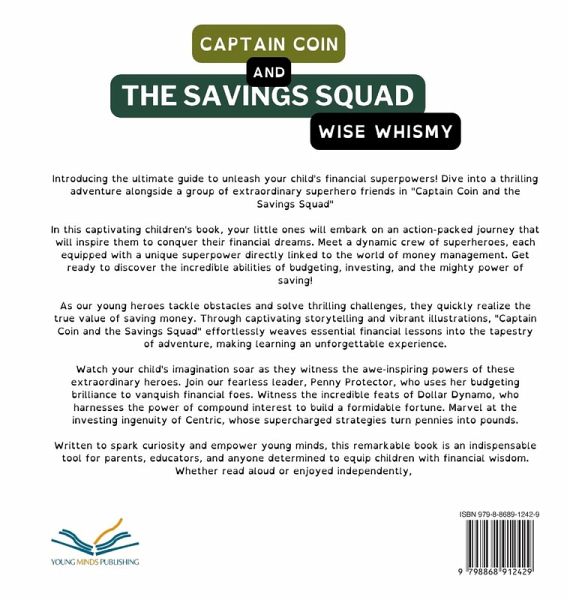 Introducing the ultimate guide to unleash your child's financial superpowers! Dive into a thrilling adventure alongside a group of extraordinary superhero friends in "Captain Coin and the Savings Squad" In this captivating children's book, your little ones will embark on an action-packed journey that will inspire them to conquer their financial dreams. Meet a dynamic crew of superheroes, each equipped with a unique superpower directly linked to the world of money management. Get ready to discover the incredible abilities of budgeting, investing, and the mighty power of saving! As our young heroes tackle obstacles and solve thrilling challenges, they quickly realize the true value of saving money. Through captivating storytelling and vibrant illustrations, "Captain Coin and the Savings Squad" effortlessly weaves essential financial lessons into the tapestry of adventure, making learning an unforgettable experience. Watch your child's imagination soar as they witness the awe-inspiring powers of these extraordinary heroes. Join our fearless leader, Penny Protector, who uses her budgeting brilliance to vanquish financial foes. Witness the incredible feats of Dollar Dynamo, who harnesses the power of compound interest to build a formidable fortune. Marvel at the investing ingenuity of Centric, whose supercharged strategies turn pennies into pounds. But the excitement doesn't stop there! Alongside our incredible protagonists, your child will learn valuable lessons about delayed gratification, setting goals, and the importance of resilience. With "Captain Coin and the Savings Squad" they'll discover that managing money can be as thrilling as any daring rescue mission! Designed to spark curiosity and empower young minds, this remarkable book is an indispensable tool for parents, educators, and anyone determined to equip children with financial wisdom. Whether read aloud or enjoyed independently, "Captain Coin and the Savings Squad" promises an exhilarating ride that will leave your child clamoring for more. Prepare your little one for a lifetime of financial success and empower them to become the heroes of their own financial destiny. Don't miss out on this extraordinary opportunity to inspire, educate, and entertain. Grab your copy of "Captain Coin and the Savings Squad" today and let the adventure begin!