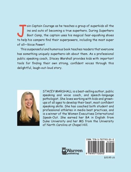 Join Captain Courage as he teaches a group of superkids all the ins and outs of becoming a true superhero. During Superhero Boot Camp, the captain uses his magical fear-squishing shoes to help his campers find their superpowers, including the most super of all-Voice Power!This suspenseful and humorous book teaches readers that everyone has something uniquely superhero-ish about them. As a professional public speaking coach, Stacey Marshall provides kids with important tools for finding their own strong, confident voices through this delightful, laugh-out-loud story.