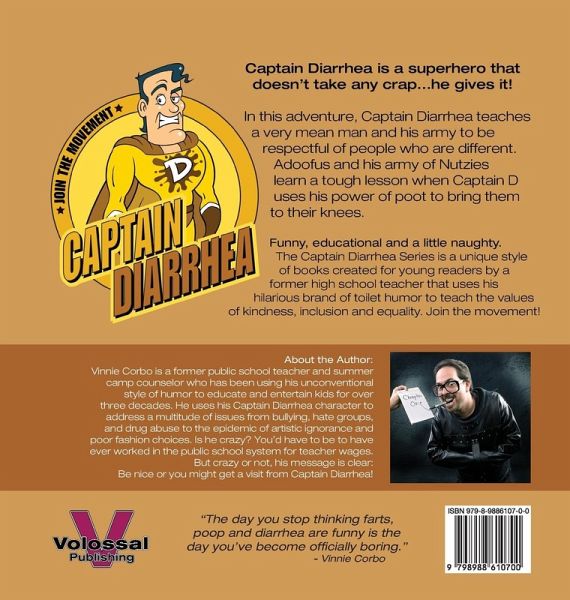 Captain Diarrhea is a superhero that doesn't take any crap...he gives it! In this adventure, Captain Diarrhea teaches a very mean man and his army to be respectful of people who are different. Adoofus and his army of Nutzies learn a tough lesson when Captain D uses his power of poot to bring them to their knees. Funny, educational and a little naughty. The Captain Diarrhea Series is a unique style of books created for young readers by a former high school teacher that uses a hilarious brand of toilet humor to teach the values of kindness, inclusion and equality. Join the movement!