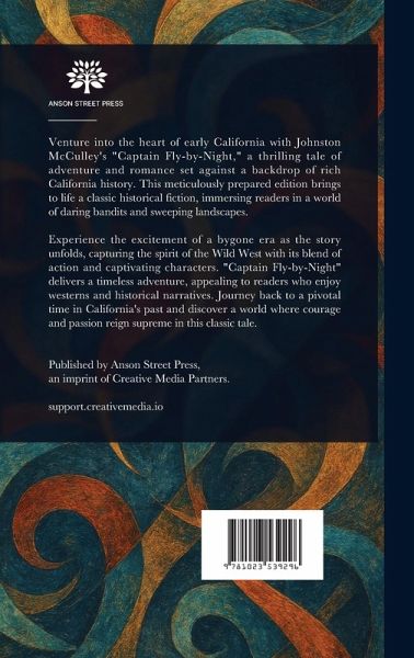 Venture into the heart of early California with Johnston McCulley's "Captain Fly-by-Night," a thrilling tale of adventure and romance set against a backdrop of rich California history. This meticulously prepared edition brings to life a classic historical fiction, immersing readers in a world of daring bandits and sweeping landscapes. Experience the excitement of a bygone era as the story unfolds, capturing the spirit of the Wild West with its blend of action and captivating characters. "Captain Fly-by-Night" delivers a timeless adventure, appealing to readers who enjoy westerns and historical narratives. Journey back to a pivotal time in California's past and discover a world where courage and passion reign supreme in this classic tale. This work has been selected by scholars as being culturally important, and is part of the knowledge base of civilization as we know it. This work is in the public domain in the United States of America, and possibly other nations. Within the United States, you may freely copy and distribute this work, as no entity (individual or corporate) has a copyright on the body of the work. Scholars believe, and we concur, that this work is important enough to be preserved, reproduced, and made generally available to the public. We appreciate your support of the preservation process, and thank you for being an important part of keeping this knowledge alive and relevant.