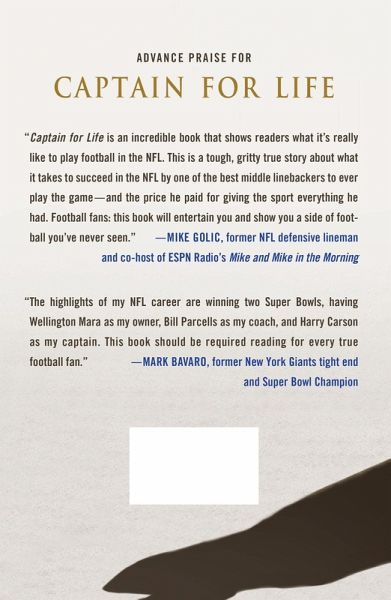Captain for Life offers a unique and powerful personal tale about the great joy and devastating price of playing professional football, by a legendary former NFL linebacker Harry Carson. One of the greatest linebackers to ever play professional football, Harry Carson built a reputation during his 13 years in the NFL as a fearsome, physical and passionate player who would give everything he had to win. Whether violently tackling running backs, engaging blockers with reckless abandon or ferociously attacking the line of scrimmage, Carson will always be remembered as having played the game the way it's meant to be played--all out. For the first time ever, this legendary athlete takes readers on an unlikely journey to the NFL that began in the small town of Florence, South Carolina to his days at little known South Carolina State University--and then the bright lights of professional football in New York, playing for the Giants. Carson's story of his life as a football player and after his retirement is more powerful and eye-opening than any that's come before. Within these pages, Carson reveals the startling truth behind the sacrifices these great warriors make for our entertainment, the thrill of stepping onto a field with 80,000 fans screaming your name, and the debilitating physical and mental toll this violent and uncompromising game takes. With insight into some of the game's biggest stars, from Lawrence Taylor to Bill Parcells to Phil Simms this book is a must for any NFL fan.
