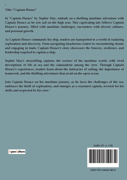 " Title: "Captain Horace" In "Captain Horace" by Sophie May, embark on a thrilling maritime adventure with Captain Horace as he sets sail on the high seas. This captivating tale follows Captain Horace's journey, filled with maritime challenges, encounters with diverse cultures, and personal growth. As Captain Horace commands his ship, readers are transported to a world of seafaring exploration and discovery. From navigating treacherous waters to encountering storms and engaging in trade, Captain Horace's story showcases the bravery, resilience, and leadership required to captain a ship. Sophie May's storytelling captures the essence of the maritime world, with vivid descriptions of life at sea and the camaraderie among the crew. Through Captain Horace's experiences, readers learn about the intricacies of sailing, the importance of teamwork, and the thrilling adventures that await on the open ocean. Join Captain Horace on his maritime journey, as he faces the challenges of the sea, embraces the thrill of exploration, and emerges as a seasoned captain, revered for his skills and respected by his crew."