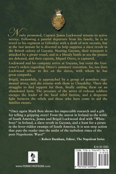 Newly promoted, Captain James Lockwood returns to active service. Following a painful departure from his family, he is to travel to his regiment at Gibraltar with a draft of new recruits, but at the last minute he is diverted to help suppress a slave revolt in the British colony of Guyana. Nearing Guyana, their transport is attacked by a pirate vessel, and in a bloody battle at sea the pirates are defeated, and their captain, Miguel Otero, is captured. Lockwood and his company arrive at Guyana, but resist the Governor's orders regarding Otero's summary execution. So, too does Lockwood refuse to fire on the slaves, with whom he has great sympathy. Brigid, meanwhile, is approached by a group of penniless regimental wives, and she returns with them to Clonakilty. There she struggles to find support for them, finally settling them on an abandoned farm. The presence of the wives of redcoat soldiers enrages the leader of the local rebel faction, and a desperate fight between the rebels and those who have come to aid the families ensues. "Once again Mark Bois shows his impeccable research and a gift for telling a gripping story! From the unrest in Ireland to the wilds of South America, James and Brigid Lockwood deal with "Whiteboys" in Ireland, a slave revolt in Guyana, and a hunt for a pirate in the fever-ridden swamps of South America. It is non-stop action that puts the reader into the midst of the turbulent times of the post-Napoleonic Wars!" -Robert Burnham, Editor, The Napoleon Series