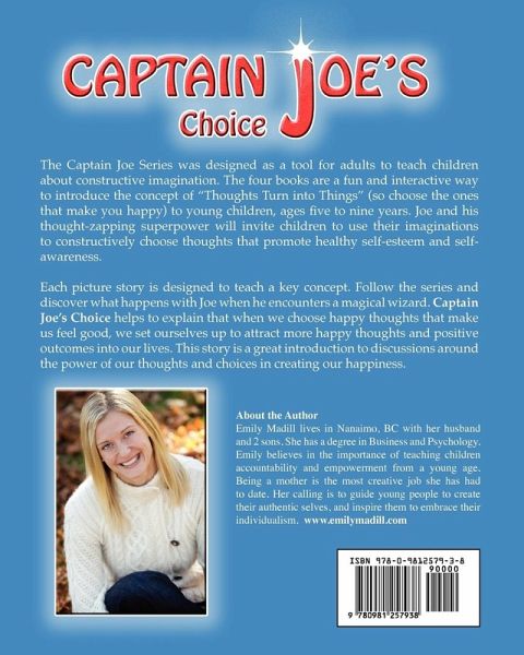 The Captain Joe Series was designed as a tool for adults to teach children about constructive imagination. The four books are a fun and interactive way to introduce the concept of "Thoughts Turn into Things" (so choose the ones that make you happy) to young children, ages five to nine years. Joe and his thought-zapping superpower will invite children to use their imaginations to constructively choose thoughts that promote healthy self-esteem and self-awareness. Each picture story is designed to teach a key concept. Captain Joe's Choice is the fourth book in the series and teaches children that when we choose happy thoughts that feel good, we set ourselves up to have more happy thoughts and positive outcomes in our lives. Readers will witness Joe's starring role on the big screen and how his thoughts and choices influence the different outcomes. Joe uses his 'thought zapping superpower' to help him reach the end result he wants. This story will set the foundation for children to begin recognizing and choosing thoughts that feel good and boost their confidence in all areas of life. It's a great introduction to discussions around the cause and effects of our thoughts and choices.