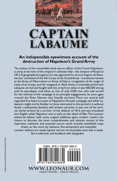 An indispensible eyewitness account of the destruction of Napoleon's Grand Army The author of this remarkable book was an officer of the French Napoleonic army at the time of the emperor's ultimate folly-the invasion of Russia in 1812. A geographical engineer, he was appointed to viceroy Eugene de Beauharnais' command of the 4th Corps of the Grand Army-sometimes known as the Army of Observation or Army of Italy, in recognition of the origin of many of its troops and the vanguard or flank duties it invariably performed. Labaume served and fought with the army from when it was 400,000 strong until its apocalyptic end when, as one of only 4,000 men who had served for the entirety of the campaign in its principal engagements, he once again crossed the River Niemen into friendly territory. There are several well regarded first hand accounts of Napoleon's Russian campaign and while Labaume's might not be familiar to those interested in this period it is without doubt a substantial, detailed, well written narrative. It was one of the earliest works written by a survivor of the debacle of 1812 and was translated into English while Napoleon was in exile on the island of Elba. This Leonaur enhanced edition, with some original additions, gives modern readers the chance to discover the most comprehensive and relevant version of this important, authentic and essential source work. Includes battlefield maps drawn on the scene by Labaume. Recommended and invaluable. Leonaur editions are newly typeset and are not facsimiles; each title is available in softcover and hardback with dustjacket.