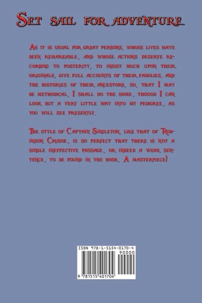Set sail for adventure! As it is usual for great persons, whose lives have been remarkable, and whose actions deserve recording to posterity, to insist much upon their originals, give full accounts of their families, and the histories of their ancestors, so, that I may be methodical, I shall do the same, though I can look but a very little way into my pedigree, as you will see presently. The style of Captain Singleton, like that of Robinson Crusoe, is so perfect that there is not a single ineffective passage, or indeed a weak sentence, to be found in the book. A masterpiece!