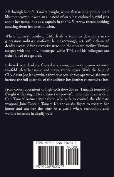 All through her life, Tamara Knight, whose first name is pronounced like tomorrow but with an a instead of an o, has endured playful jabs about her name. But as a captain in the U. S. Army, there's nothing amusing about her latest mission. When Tamara's brother, T.M., leads a team to develop a next-generation military uniform, he unknowingly sets off a chain of deadly events. After a terrorist attack on the research facility, Tamara escapes with the only prototype, while T.M. and his colleagues are either killed or captured. Believed to be dead and framed as a traitor, Tamara's mission becomes twofold: clear her name and rescue the hostages. With the help of CIA Agent Joe Jankowski, a former special forces operative, she must harness the full potential of the uniform her brother entrusted to her. From covert operations to high-tech showdowns, Tamara's journey is fraught with danger. Her enemies are powerful, and their reach is vast. Can Tamara outmaneuver those who seek to control the ultimate weapon? Join Captain Tamara Knight as she fights to reclaim her honor and uncover the truth in a world where technology and warfare intersect in deadly ways.