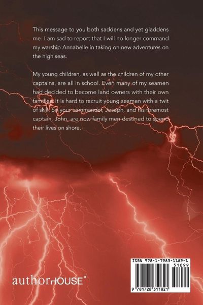 This message to you both saddens and yet gladdens me. I am sad to report that I will no longer command my warship Annabelle in taking on new adventures on the high seas. My young children, as well as the children of my other captains, are all in school. Even many of my seamen had decided to become land owners with their own families. It is hard to recruit young seamen with a twit of skill. So your commander, Joseph, and his foremost captain, John, are now family men destined to spend their lives on shore.