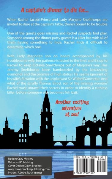 A captain's dinner to die for... Rachel Jacobi-Prince and Lady Marjorie Snellthorpe are delighted to be invited to dine at the captain's table. A pleasant dinner, shared with Marjorie's son and troublesome daughter-in-law, becomes less palatable when the guest of honour goes missing. Rachel suspects foul play, and with a slew of suspects who each have motives, she fears she could be too late to stop the killer getting away with the crime. One of the dinner guests is a killer, but with all of them having something to hide, Rachel finds it difficult to narrow it down. With Lady Marjorie's son determined to do business while on board ship and his wife flirting with the unpleasant Sir Wilfred Vanmeter, Rachel and Marjorie's patience could be tested to the limit.It's up to Rachel to keep Octavia Snellthorpe out of Marjorie's way while trying to track down a killer before somebody else ends up in a body bag. It appears all of the guests, including Jeremy Snellthorpe were bamboozled by the bedazzling diamonds that have also gone missing, presumed stolen... Jeremy seems ignorant of his wife's flirtation, but is he? And what of the scruffy Thomas Elrod, son of the missing woman?Rachel must unravel each of their secrets in order to identify a ruthless killer, before someone else becomes fish bait. Captain's Dinner Cruise Murder is the exciting tenth book in the Rachel Prince Mystery series. If you like seafaring suspense, dastardly deaths, and edge-of-your-lifeboat tension, you'll love Dawn Brookes's latest adventure.