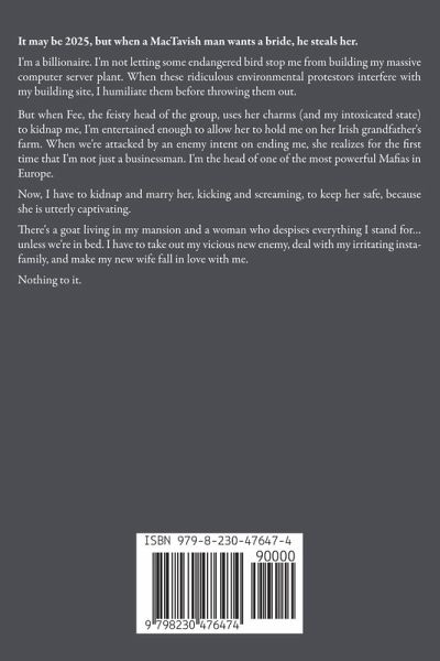 It may be 2025, but when a MacTavish man wants a bride, he steals her. I'm a billionaire. I'm not letting some endangered bird stop me from building my massive computer server plant. When these ridiculous environmental protestors interfere with my building site, I humiliate them before throwing them out. But when Fee, the feisty head of the group, uses her charms (and my intoxicated state) to kidnap me, I'm entertained enough to allow her to hold me on her Irish grandfather's farm. When we're attacked by an enemy intent on ending me, she realizes for the first time that I'm not just a businessman. I'm the head of one of the most powerful Mafias in Europe. Now, I have to kidnap and marry her, kicking and screaming, to keep her safe, because she is utterly captivating. There's a goat living in my mansion and a woman who despises everything I stand for... unless we're in bed. I have to take out my vicious new enemy, deal with my irritating insta-family, and make my new wife fall in love with me. Nothing to it.