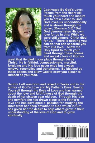 Captivated By God's Love: Poems from the Heart will touch your heart and inspire you to draw closer to God. God loves us unconditionally and is shown through the cross; (Romans 5:8) "But God demonstrates His own love for us in this: While we were still sinners, Christ died for us." There is nothing you can do that can separate you from His love. Allow the Holy Spirit to touch your heart through these poems and reveal a love of God so great that He died in our place through Jesus Christ. He is faithful, compassionate, merciful, forgiving and His love never ends but always renews, reconciles and transforms. Be blessed by these poems and allow God to draw you closer to Himself as you read.