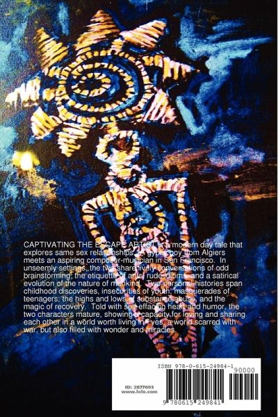 CAPTIVATING THE ESCAPE ARTIST is a modern day tale that explores same sex relationships. A gypsy boy from Algiers meets an aspiring composer-musician in San Francisco. In unseemly settings, they share lively conversations about ant etiquette, rude idioms, and a satirical history of mankind. Their two histories span childhood discoveries, the insecurities of teenagers, highs and lows of substance abuse, and the miracles of recovery. Told with self-effacing heart and humor, the two characters mature, showing a capacitiy for loving and sharing each other in a world worth living in - yes, a world scarred with war, but also filled with magic and wonder.