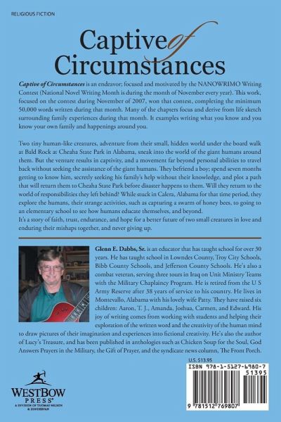 Captive of Circumstances is an endeavor; focused and motivated by the NANOWRIMO Writing Contest (National Novel Writing Month is during the month of November every year). This work, focused on the contest during November of 2007, won that contest, completing the minimum 50,000 words written during that month. Many of the chapters focus and derive from life sketch surrounding family experiences during that month. It examples writing what you know and you know your own family and happenings around you. Two tiny human-like creatures, adventure from their small, hidden world under the board walk at Bald Rock at Cheaha State Park in Alabama, sneak into the world of the giant humans around them. But the venture results in captivity, and a movement far beyond personal abilities to travel back without seeking the assistance of the giant humans. They befriend a boy; spend seven months getting to know him, secretly seeking his family’s help without their knowledge, and plot a path that will return them to Cheaha State Park before disaster happens to them. Will they return to the world of responsibilities they left behind? While stuck in Calera, Alabama for that time period, they explore the humans, their strange activities, such as capturing a swarm of honey bees, to going to an elementary school to see how humans educate themselves, and beyond. It’s a story of faith, trust, endurance, and hope for a better future of two small creatures in love and enduring their mishaps together, and never giving up.