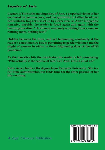 Captive of Fate is the moving story of Ann, a victim of her own need for genuine love, and her gullibility in falling head over heels into the traps of lust set up by clever men. As Ann's biographic narrative unfolds, the reader is faced again and again with the haunting question: "Do all men want only one thing from a woman?" Hidden between the lines and yet hammering constantly at the reader's conscience are issues pertaining to gender violence and the plight of women in Africa.