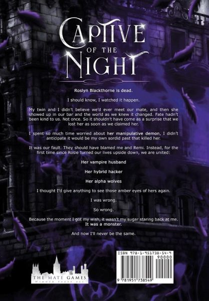 Roslyn Blackthorne is dead. I should know, I watched it happen. My twin and I didn't believe we'd ever meet our mate, and then she showed up in our bar and the world as we knew it changed. Fate hadn't been kind to us. Not once. So it shouldn't have come as a surprise that we lost her as soon as we claimed her. I spent so much time worried about her manipulative demon, I didn't anticipate it would be my own sordid past that killed her. It was our fault. They should have blamed me and Remi. Instead, for the first time since Rosie turned our lives upside down, we are united: Her vampire husband Her hybrid hacker Her alpha wolves I thought I'd give anything to see those amber eyes of hers again. I was wrong. So wrong. Because the moment I got my wish, it wasn't my sugar staring back at me. It was a monster. And now I'll never be the same.