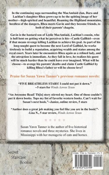 In the continuing saga surrounding the MacAmlaid clan, Dara and Lachlan's daughter Rhea grows up to be the spitting image of her mother-high-spirited and beautiful. Roaming the Highland mountains, heedless of the dangers, Rhea meets Gavin and they become friends, to both of their parents' chagrin. Gavin is the bastard son of Leslie MacAmlaid, Lachlan's cousin, who is hell bent on getting what he perceives is his-Castle Gallhiel-even if that means revenge killing Lachlan to achieve his goal. As part of his long-sought quest to become the next Lord of Gallhiel, he works tirelessly to build a reputation, acquiring wealth and status among the royal court. Years later he encounters Rhea again as a refined lady, and the attraction is immediate. As they fall in love, he realizes his quest will be much harder than he could have ever imagined. What will he choose-to avenge his parents' deaths and claim Castle Gallhiel by killing Rhea's father or will he choose love? Praise for Susan Yawn Tanner's historical romances: "Action packed and poignant. ..builds tension from the very beginning and will keep you turning pages until the very end. Ms. Tanner's straightforward style never allows for a dull moment." -Linda Sandifer, author of Embrace The Wind "Susan Tanner captures the fierce independence and adventurous spirit that marked the developing West. A heart-touching read." -Elizabeth Leigh, author of Prairie Ecstasy