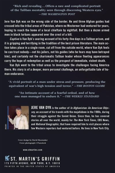 Jere Van Dyk was on the wrong side of the border. He and three Afghan guides had crossed into the tribal areas of Pakistan, where no Westerner had ventured for years, hoping to reach the home of a local chieftain by nightfall. But then a dozen armed men in black turbans appeared over the crest of a hill. Captive is Van Dyk's searing account of his forty-five days in a Taliban prison, and it is gripping and terrifying in the tradition of the best prison literature. The main action takes place in a single room, cut off from the outside world, where Van Dyk feels he can trust nobody-not his jailers, not his guides (who he fears may have betrayed him), and certainly not the charismatic Taliban leader whose fleeting appearances carry the hope of redemption as well as the prospect of immediate, violent death. Van Dyk went to the tribal areas to investigate the challenges facing America there. His story is of a deeper, more personal challenge, an unforgettable tale of human endurance.