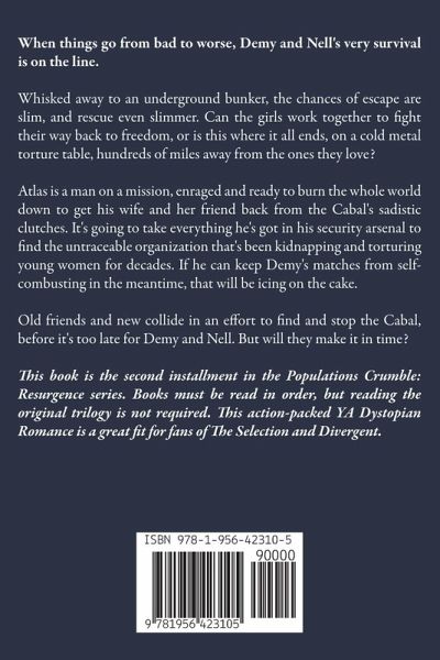 When things go from bad to worse, Demy and Nell's very survival is on the line. Whisked away to an underground bunker, the chances of escape are slim, and rescue even slimmer. Can the girls work together to fight their way back to freedom, or is this where it all ends, on a cold metal torture table, hundreds of miles away from the ones they love? Atlas is a man on a mission, enraged and ready to burn the whole world down to get his wife and her friend back from the Cabal's sadistic clutches. It's going to take everything he's got in his security arsenal to find the untraceable organization that's been kidnapping and torturing young women for decades. If he can keep Demy's matches from self-combusting in the meantime, that will be icing on the cake. Old friends and new collide in an effort to find and stop the Cabal, before it's too late for Demy and Nell. But will they make it in time? This book is the second installment in the Populations Crumble: Resurgence series. Books must be read in order, but reading the original trilogy is not required. This action-packed YA Dystopian Romance is a great fit for fans of The Selection and Divergent.
