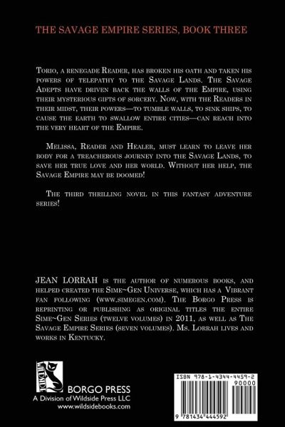 Torio, a renegade Reader, has broken his oath and taken his powers of telepathy to the Savage Lands. The Savage Adepts have driven back the walls of the Empire, using their mysterious gifts of sorcery. Now, with the Readers in their midst, their powers--to tumble walls, to sink ships, to cause the earth to swallow entire cities--can reach into the very heart of the Empire. Melissa, Reader and Healer, must learn to leave her body for a treacherous journey into the Savage Lands, to save her true love and her world. Without her help, the Savage Empire may be doomed! The third thrilling novel in this fantasy adventure series!