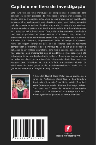 Este livro fornece uma introdução às competências necessárias para conduzir ou redigir projectos de investigação empresarial aplicada. Foi escrito para dois públicos: estudantes de pós-graduação em investigação empresarial e profissionais que desejam saber mais sobre questões actuais no contexto da investigação empresarial, ou aqueles que precisam de uma referência prática, mas teoricamente sólida. Este livro distingue-se em muitos aspectos importantes. Cada artigo sobre métodos quantitativos descreve as principais escolhas teóricas e a forma como estas são executadas em várias ferramentas estatísticas, como o IBM SPSS Statistics, o E-Views e o SmartPLS, respetivamente. Todos os artigos são escritos numa abordagem abrangente para que os leitores possam facilmente compreender a informação que é introduzida. Cada artigo demonstra a aplicação de um método quantitativo. Este livro é conciso, concentrando-se nos aspectos mais importantes que os académicos, investigadores e até estudantes de pós-graduação devem conhecer. Esperamos que os leitores de todos os níveis possam beneficiar plenamente deste livro nos seus esforços para concretizar os seus objectivos e esperanças através de actividades de investigação e de auto-desenvolvimento nesta era de globalização e de aprendizagem ao longo da vida.