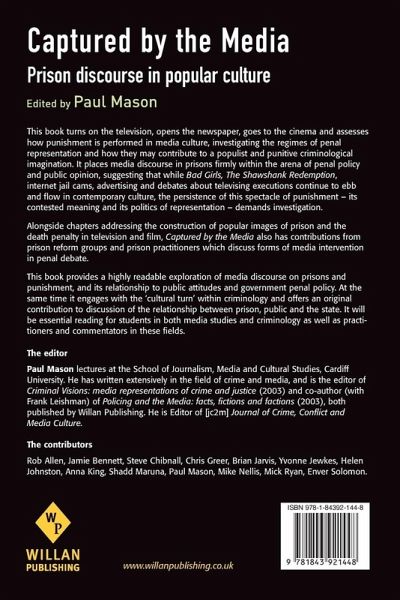 This book turns on the television, opens the newspaper, goes to the cinema and assesses how punishment is performed in media culture, investigating the regimes of penal representation and how they may contribute to a populist and punitive criminological imagination. It places media discourse in prisons firmly within the arena of penal policy and public opinion, suggesting that while Bad Girls, The Shawshank Redemption, internet jail cams, advertising and debates about televising executions continue to ebb and flow in contemporary culture, the persistence of this spectacle of punishment - its contested meaning and its politics of representation - demands investigation. Alongside chapters addressing the construction of popular images of prison and the death penalty in television and film, Captured by the Media also has contributions from prison reform groups and prison practitioners which discuss forms of media intervention in penal debate. This book provides a highly readable exploration of media discourse on prisons and punishment, and its relationship to public attitudes and government penal policy. At the same time it engages with the 'cultural turn' within criminology and offers an original contribution to discussion of the relationship between prison, public and the state. It will be essential reading for students in both media studies and criminology as well as practitioners and commentators in these fields.