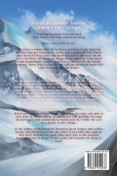 Royal alchemist Kaethe knows two things: Drinking tea made from steeped riverhearts will cure almost anything. Never, ever trust an orc. But when a rumor that she believes pertains to her missing brother has her leaving the safety and warmth of King Arkain and Queen Elvie's court, she finds herself in the heart of the orc's territory. Brokenbone Mountain is rumored to be filled with unspeakable danger. And if you can survive the harsh elements, those foul creatures that call the mountain home will enjoy feasting on your bones. Delightful. Bazur, General of the Black Claw Clan, has no time for humans. The years have turned him as cold as the mountain he calls home. The last thing he needs to turn up in one of his traps is a brightly-colored hair human who danger seems to be following like a shadow. Bazur should turn her away and let the beasts have an easy dinner. But there is something about her that stops him. That propels him to take her in and keep her safe. Even if she seems terrified of him. When one of his soldiers falls ill, Kaethe is the only one able to save him. In return, Bazur promises her safe passage through the mountain and volunteers to watch over her while she acts as a healer to his village. As the nights on Brokenbone Mountain grow longer and colder, Kaethe and Bazur learn that the other is not what they appear. Will their distrust for each other give way to the passion brewing between them? Or are some old wounds too deep to heal?