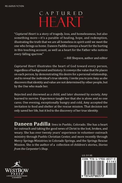 "Captured Heart is a story of tragedy, loss, and homelessness, but also something more-it's a parable of healing, hope, and redemption, illustrating the truth that we are all homeless in spirit until we meet the one who brings us home. Daneen Padilla conveys a heart for the hurting in this touching account, as well as a heart for the Father who notices every falling sparrow." -Bill Shepson, author and editor Captured Heart illustrates the heart of God toward every person, regardless of background and history. It conveys the value that He places on each person, by demonstrating His desire for a personal relationship, and to reveal the individual's true identity. I invite you to join Amy as she discovers that identity and value are not determined by other people, but by the One who made her. Rejected and disowned as a child, and later shunned by society, Amy learned to survive. Experience taught her that she is alone and no one cares. One evening, exceptionally hungry and cold, Amy accepted the invitation to food and shelter at the rescue mission. That decision not only saved her life, but it led to the discovery of her true identity.