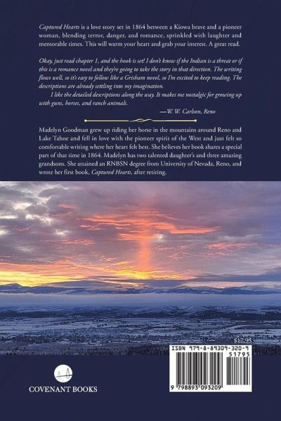 Captured Hearts is a love story set in 1864 between a Kiowa brave and a pioneer woman, blending terror, danger, and romance, sprinkled with laughter and memorable times. This will warm your heart and grab your interest. A great read. Okay, just read chapter 1, and the hook is set! I don't know if the Indian is a threat or if this is a romance novel and they're going to take the story in that direction. The writing flows well, so it's easy to follow like a Grisham novel, so I'm excited to keep reading. The descriptions are already settling into my imagination. I like the detailed descriptions along the way. It makes me nostalgic for growing up with guns, horses, and ranch animals. --W. W. Carlson, Reno