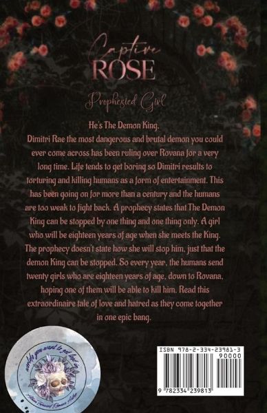 He's the Demon King, Dimitri Rae the most dangerous and brutal demon you could ever come across has been ruling over Rovana for a very long time. Life tends to get boring so Dimitri results to torturing and killing humans as a form of entertainment. This has been going on for more than a century and the humans are too weak to fight back. A prophecy states that The Demon King can be stopped by one thing and one thing only. A girl who will be eighteen years of age when she meets the King. The prophecy doesn't state how she will stop him, just that the demon King can be stopped. So every year, the humans send twenty girls who are eighteen years of age, down to Rovana, hoping one of them will be able to kill him. Read this extraordinaire tale of love and hatred as they come together in one epic bang.