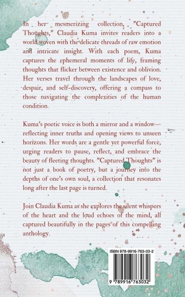 In her mesmerizing collection, "Captured Thoughts," Claudia Kuma invites readers into a world woven with the delicate threads of raw emotion and intricate insight. With each poem, Kuma captures the ephemeral moments of life, framing thoughts that flicker between existence and oblivion. Her verses travel through the landscapes of love, despair, and self-discovery, offering a compass to those navigating the complexities of the human condition. Kuma's poetic voice is both a mirror and a window-reflecting inner truths and opening views to unseen horizons. Her words are a gentle yet powerful force, urging readers to pause, reflect, and embrace the beauty of fleeting thoughts. "Captured Thoughts" is not just a book of poetry, but a journey into the depths of one's own soul, a collection that resonates long after the last page is turned. Join Claudia Kuma as she explores the silent whispers of the heart and the loud echoes of the mind, all captured beautifully in the pages of this compelling anthology. Copyright © 2024 Book Fairy Publishing
