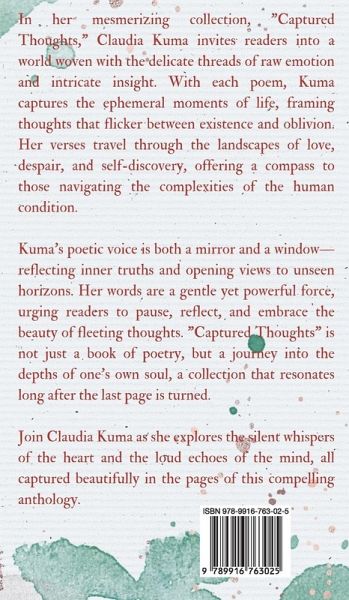 In her mesmerizing collection, "Captured Thoughts," Claudia Kuma invites readers into a world woven with the delicate threads of raw emotion and intricate insight. With each poem, Kuma captures the ephemeral moments of life, framing thoughts that flicker between existence and oblivion. Her verses travel through the landscapes of love, despair, and self-discovery, offering a compass to those navigating the complexities of the human condition. Kuma's poetic voice is both a mirror and a window-reflecting inner truths and opening views to unseen horizons. Her words are a gentle yet powerful force, urging readers to pause, reflect, and embrace the beauty of fleeting thoughts. "Captured Thoughts" is not just a book of poetry, but a journey into the depths of one's own soul, a collection that resonates long after the last page is turned. Join Claudia Kuma as she explores the silent whispers of the heart and the loud echoes of the mind, all captured beautifully in the pages of this compelling anthology. Copyright © 2024 Book Fairy Publishing