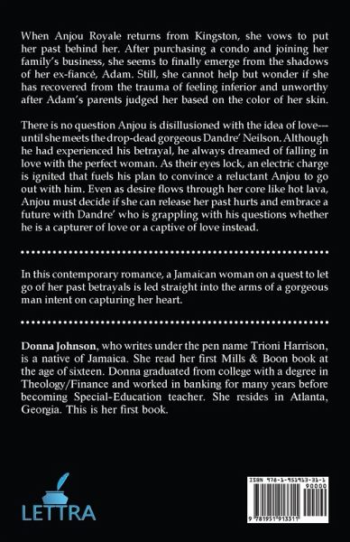 When Anjou Royale returns from Kingston, she vows to put her past behind her. After purchasing a condo and joining her family's business, she seems to fi nally emerge from the shadows of her ex-fi ancé, Adam. Still, she cannot help but wonder if she has recovered from the trauma of feeling inferior and unworthy after Adam's parents judged her based on the color of her skin. There is no question Anjou is disillusioned with the idea of love--- until she meets the drop-dead gorgeous Dandre' Neilson. Although he had experienced his betrayal, he always dreamed of falling in love with the perfect woman. As their eyes lock, an electric charge is ignited that fuels his plan to convince a reluctant Anjou to go out with him. Even as desire flows through her core like hot lava, Anjou must decide if she can release her past hurts and embrace a future with Dandre' who is grappling with his questions whether he is a capturer of love or a captive of love instead. In this contemporary romance, a Jamaican woman on a quest to let go of her past betrayals is led straight into the arms of a gorgeous man intent on capturing her heart.