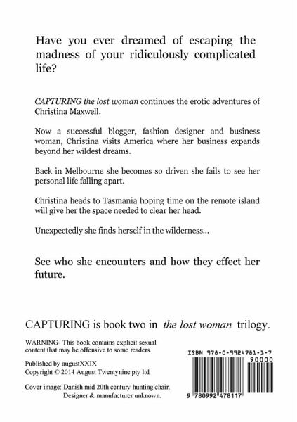 CAPTURING the lost woman is book two in The Lost Woman trilogy. The series is essentially a modern day Romance, with a strong story, supported by erotica. Directed at the Fifty Shades of Grey market, this series extends the world of female erotica by using themes of women taking control of their lives, financially, emotionally and sexually. Book two continues the art, architecture, design, fashion and food content of book one, but with an emphasis on the power of media and the notion of escaping the pressures of modern day life. The action takes place in Los Angeles, New York, inner city Melbourne and the Tasmanian wilderness. Book two is 85,000 words. Book one, AWAKENING the lost woman, saw the transformation of Christina from a dowdy housewife to a rich and successful, blogger, fashion designer and business woman. We leave her thinking she has found love, only to be rudely rejected by the man who stole her heart. CAPTURING the lost woman sees Christina visiting America where her business expands beyond her wildest dreams. Amongst the success she receives some pertinent advice; 'Find someone to share the journey with.' 'Find a life away from work.' 'Find a place to escape to.' 'And lastly, have fun... ' Back in Melbourne things don't go to plan. Christina becomes so driven she fails to see her personal life falling apart around her. Her close friends tell her she needs to take time out. She heads to Tasmania hoping time on the remote island will give her the space needed to clear her head, and to think about how she might act on the wise words given by her American friends. Unexpectedly she finds herself in the wilderness and is forced to seriously contemplate what her future might hold. 'Getting away from it all' might not be the answer. Beware of what you wish for...