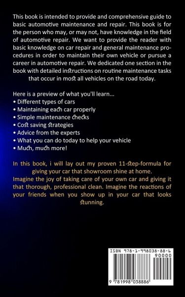 This book is intended to provide and comprehensive guide to basic automotive maintenance and repair. This book is for the person who may, or may not, have knowledge in the field of automotive repair. We want to provide the reader with basic knowledge on car repair and general maintenance procedures in order to maintain their own vehicle or pursue a career in automotive repair. We dedicated one section in the book with detailed instructions on routine maintenance tasks that occur in most all vehicles on the road today. Here is a preview of what you'll learn...Different types of cars Maintaining each car properly Simple maintenance checks Cost saving strategies Advice from the experts What you can do today to help your vehicle Much, much more! In this book, i will lay out my proven 11-step-formula for giving your car that showroom shine at home. Imagine the joy of taking care of your own car and giving it that thorough, professional clean. Imagine the reactions of your friends when you show up in your car that looks stunning.