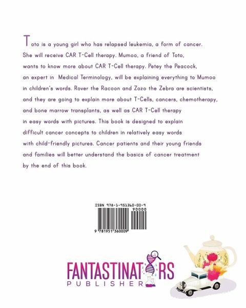 Toto is a young girl who has relapsed leukemia, a form of cancer. She will receive CAR T-Cell therapy. Mumoo, a friend of Toto, wants to know more about CAR T-Cell therapy. Petey the Peacock, an expert in Medical Terminology, will be explaining everything to Mumoo in children’s words. Rover the Racoon and Zozo the Zebra are scientists, and they are going to explain more about T-Cells, cancers, chemotherapy, and bone marrow transplants, as well as CAR T-Cell therapy in easy words with pictures. This book is designed to explain difficult cancer concepts to children in relatively easy words with child-friendly pictures. Cancer patients and their young friends and families will better understand the basics of cancer treatment by the end of this book.