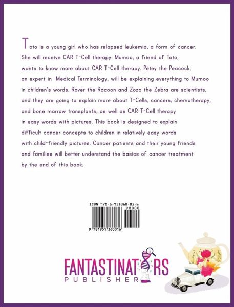 Toto is a young girl who has relapsed leukemia, a form of cancer. She will receive CAR T-Cell therapy. Mumoo, a friend of Toto, wants to know more about CAR T-Cell therapy. Petey the Peacock, an expert in Medical Terminology, will be explaining everything to Mumoo in children’s words. Rover the Racoon and Zozo the Zebra are scientists, and they are going to explain more about T-Cells, cancers, chemotherapy, and bone marrow transplants, as well as CAR T-Cell therapy in easy words with pictures. This book is designed to explain difficult cancer concepts to children in relatively easy words with child-friendly pictures. Cancer patients and their young friends and families will better understand the basics of cancer treatment by the end of this book.