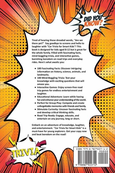 Tired of hearing those dreaded words, "Are we there yet?" Say goodbye to screens and hello to laughter with "Car Trip Trivia for Smart Kids"! This book is designed for kids aged 8-12 but is great for the whole family. Filled with fascinating facts, mind-boggling trivia, and interactive games, banishing boredom on road trips and everyday rides. Here's what awaits you: ¿ 100 Fascinating Facts: Discover intriguing information on history, science, animals, and landmarks. ¿ 100 Mind-Boggling Trivia: Test your knowledge with exciting questions that will amaze you. ¿ Interactive Games: Enjoy screen-free road trip games for endless entertainment and laughter. ¿ Educational Adventure: Learn while having fun and enhance your understanding of the world. ¿ Perfect for Group Play: Compete and create unforgettable memories with friends and family. ¿ Stimulate Curiosity: Uncover fascinating facts and develop critical thinking skills. ¿ Road Trip Ready: Engage, educate, and entertain on any journey, long or short. Embark on an adventure of knowledge, laughter, and entertainment. "Car Trip Trivia for Smart Kids" is a must-have for young explorers. Get your copy now and beat boredom on the road!
