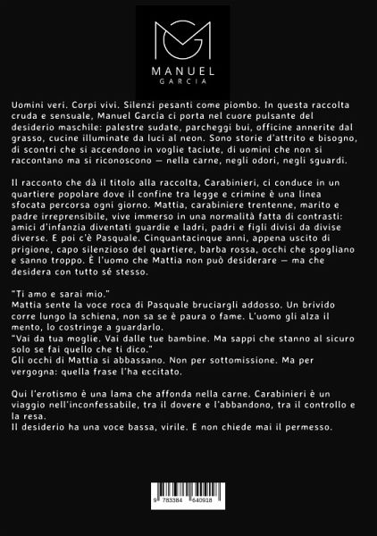Uomini veri. Corpi vivi. Silenzi pesanti come piombo. In questa raccolta cruda e sensuale, Manuel García ci porta nel cuore pulsante del desiderio maschile: palestre sudate, parcheggi bui, officine annerite dal grasso, cucine illuminate da luci al neon. Sono storie d'attrito e bisogno, di scontri che si accendono in voglie taciute, di uomini che non si raccontano ma si riconoscono - nella carne, negli odori, negli sguardi.Il racconto che dà il titolo alla raccolta, Carabinieri, ci conduce in un quartiere popolare dove il confine tra legge e crimine è una linea sfocata percorsa ogni giorno. Mattia, carabiniere trentenne, marito e padre irreprensibile, vive immerso in una normalità fatta di contrasti: amici d'infanzia diventati guardie e ladri, padri e figli divisi da divise diverse. E poi c'è Pasquale. Cinquantacinque anni, appena uscito di prigione, capo silenzioso del quartiere, barba rossa, occhi che spogliano e sanno troppo. È l'uomo che Mattia non può desiderare - ma che desidera con tutto sé stesso."Ti amo e sarai mio."Mattia sente la voce roca di Pasquale bruciargli addosso. Un brivido corre lungo la schiena, non sa se è paura o fame. L'uomo gli alza il mento, lo costringe a guardarlo."Vai da tua moglie. Vai dalle tue bambine. Ma sappi che stanno al sicuro solo se fai quello che ti dico."Gli occhi di Mattia si abbassano. Non per sottomissione. Ma per vergogna: quella frase l'ha eccitato.Qui l'erotismo è una lama che affonda nella carne. Carabinieri è un viaggio nell'inconfessabile, tra il dovere e l'abbandono, tra il controllo e la resa.Il desiderio ha una voce bassa, virile. E non chiede mai il permesso.